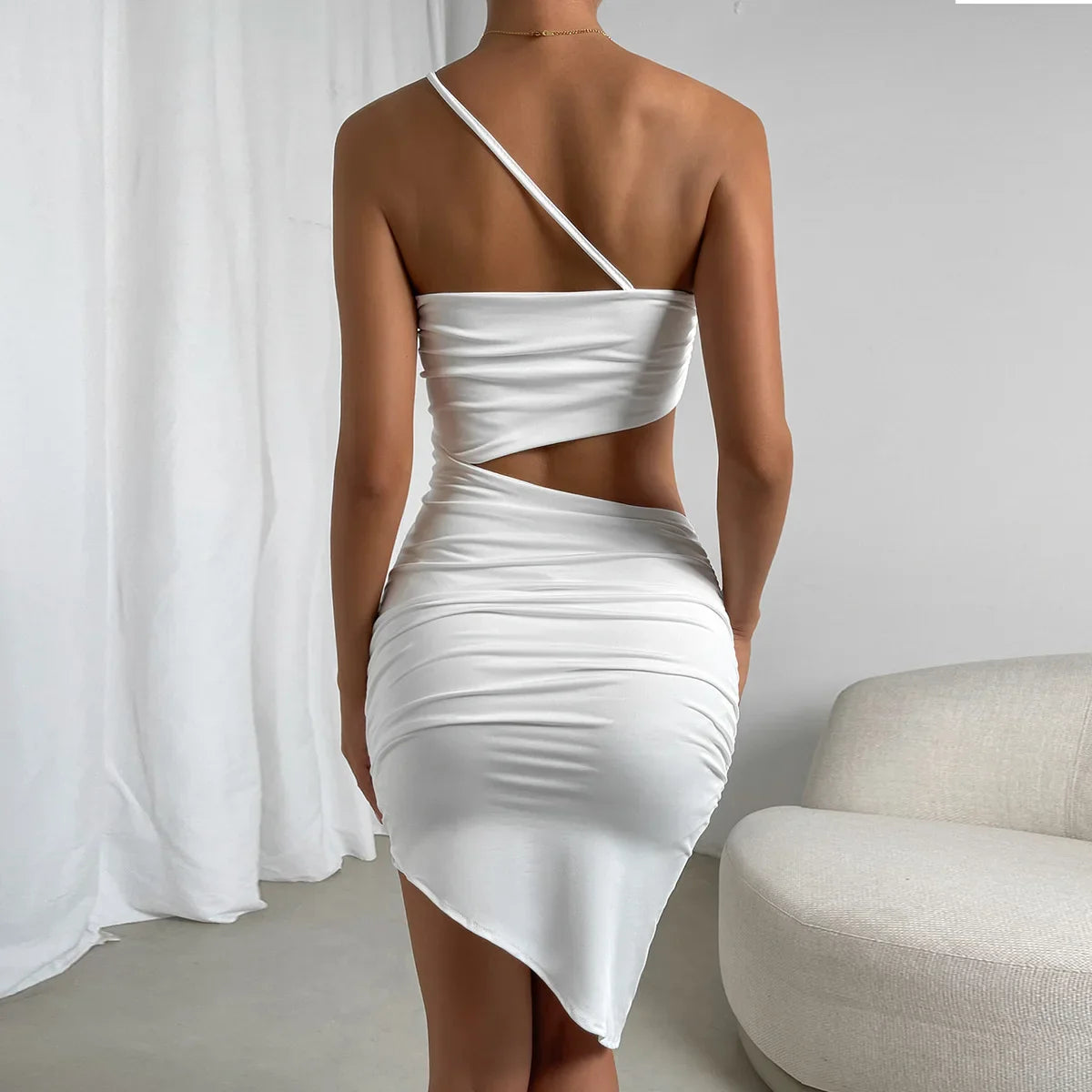 שמלת מידי סטרפלס עם גב פתוח ועיצוב א-סימטרי, בגזרה מחמיאה ובד נעים עם מתיחה קלה. משלבת סטייל ונוכחות בצורה מושלמת.